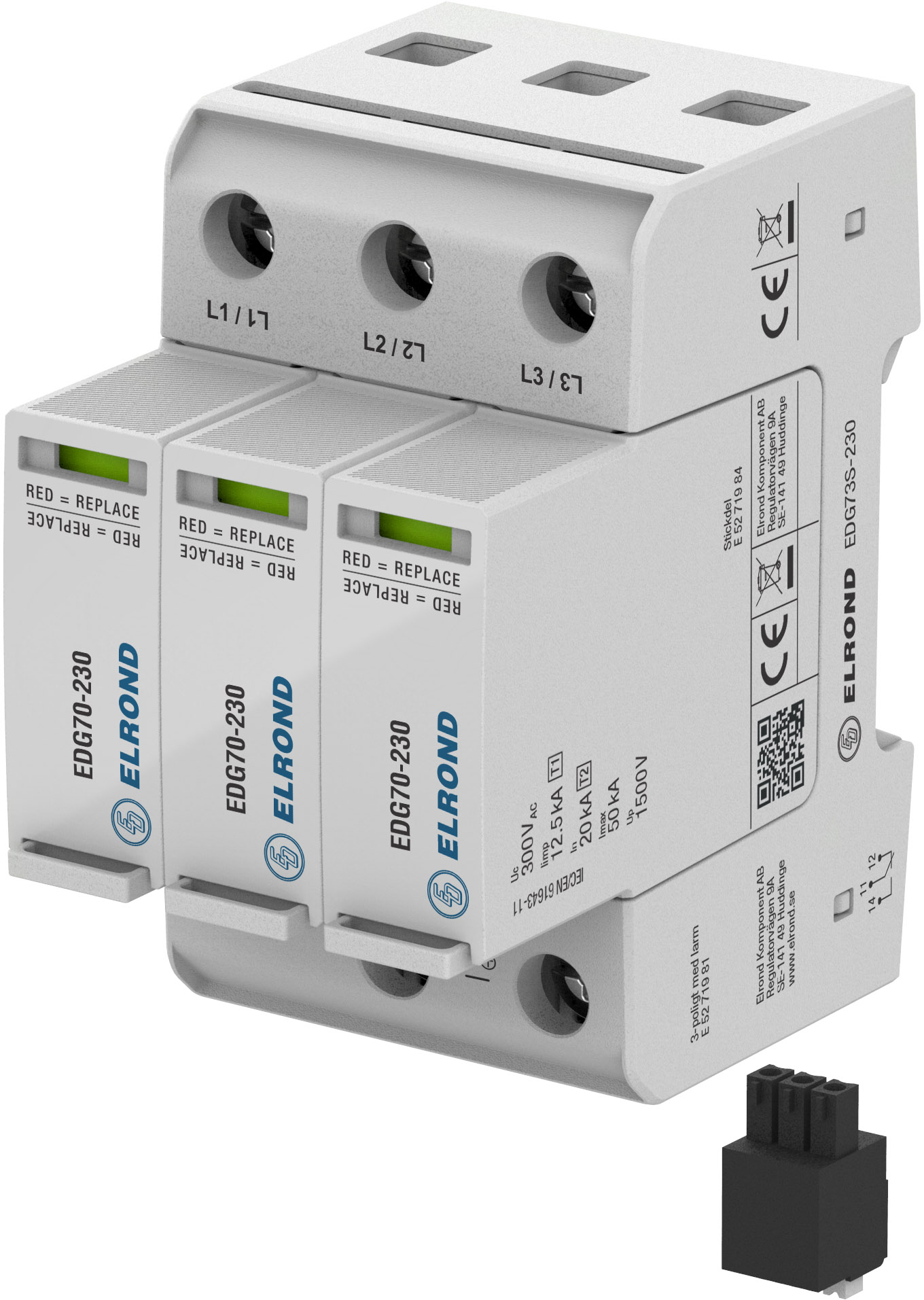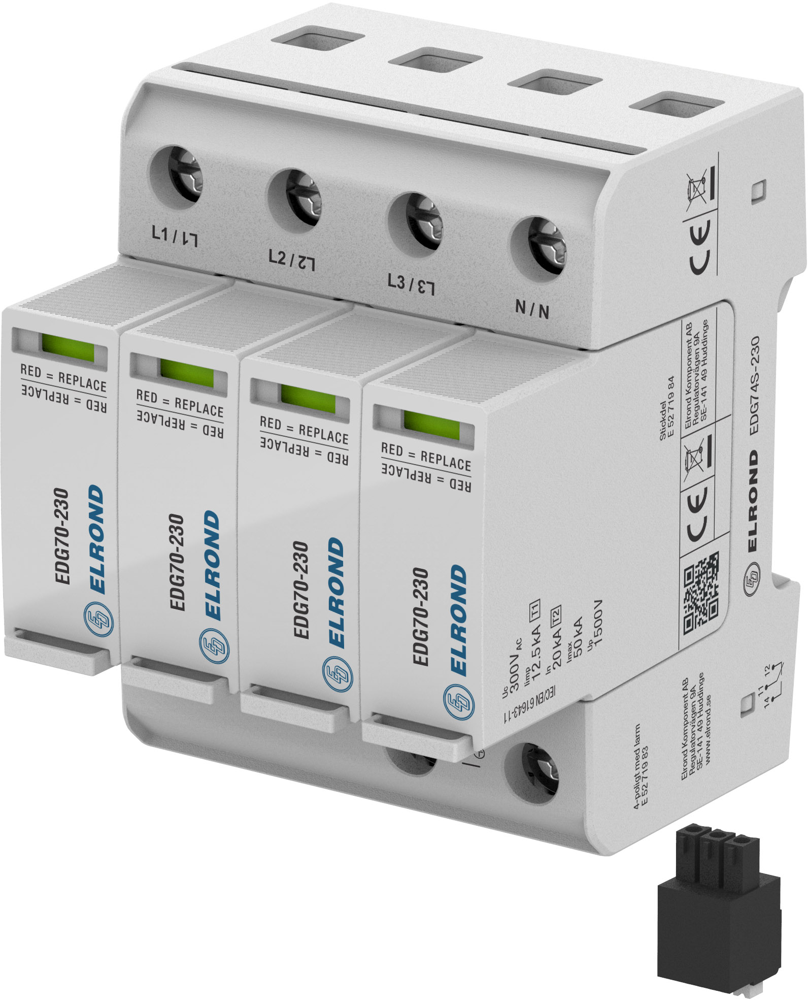 Jackbart överspänningsskydd för inkommande matning, DIN-skenmonterbart. Med växlande larmkontakt. Optimerad för hög blixtströmskapacitet (12,5kA 10/350µs). Uppfyller klass III-IV i åskledarstandarden SS-EN 62305.